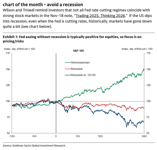 November began with a Fed rate cut, but confidence in another cut wavered mid-month as the government reopened. The S&P 500 dipped to ~6500 amid uncertainty. However, bond markets now suggest an 80%+ probability of a December rate cut, supported by weaker economic indicators like the September Payrolls report (unemployment up to 4.4%) and flagging business sentiment from regional Fed surveys. Jan Hatzius’s latest Global Views note points to a likely 25bp cut at the Dec 9-10 FOMC meeting, with limited data ahead to disrupt this trajectory.