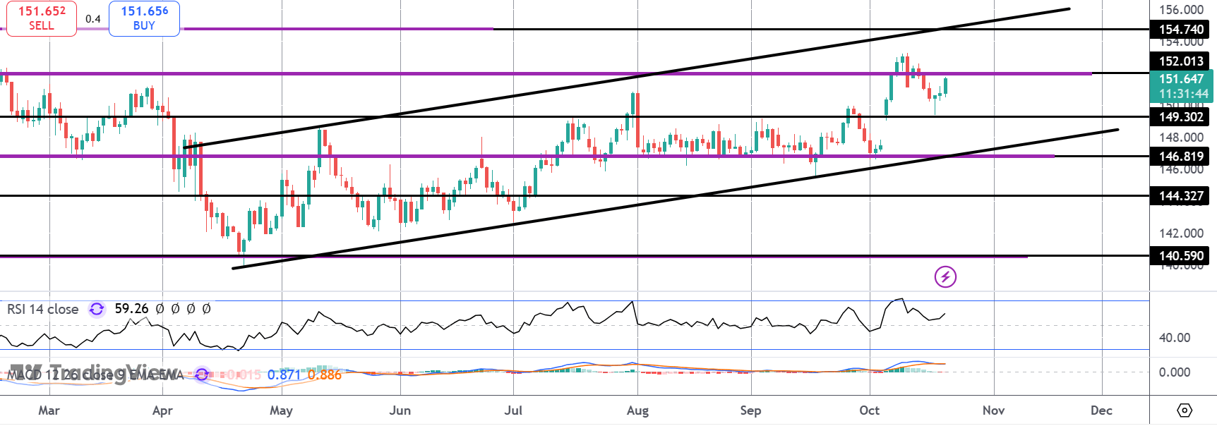 The correction lower in USDJPY found strong support into the 149.30 level with price bouncing sharply, now testing the 152 level. With momentum studies turning higher, focus is on a fresh breakout towards the 154.74 level next.  The bullish view holds while price stays above the 149.30 level.
